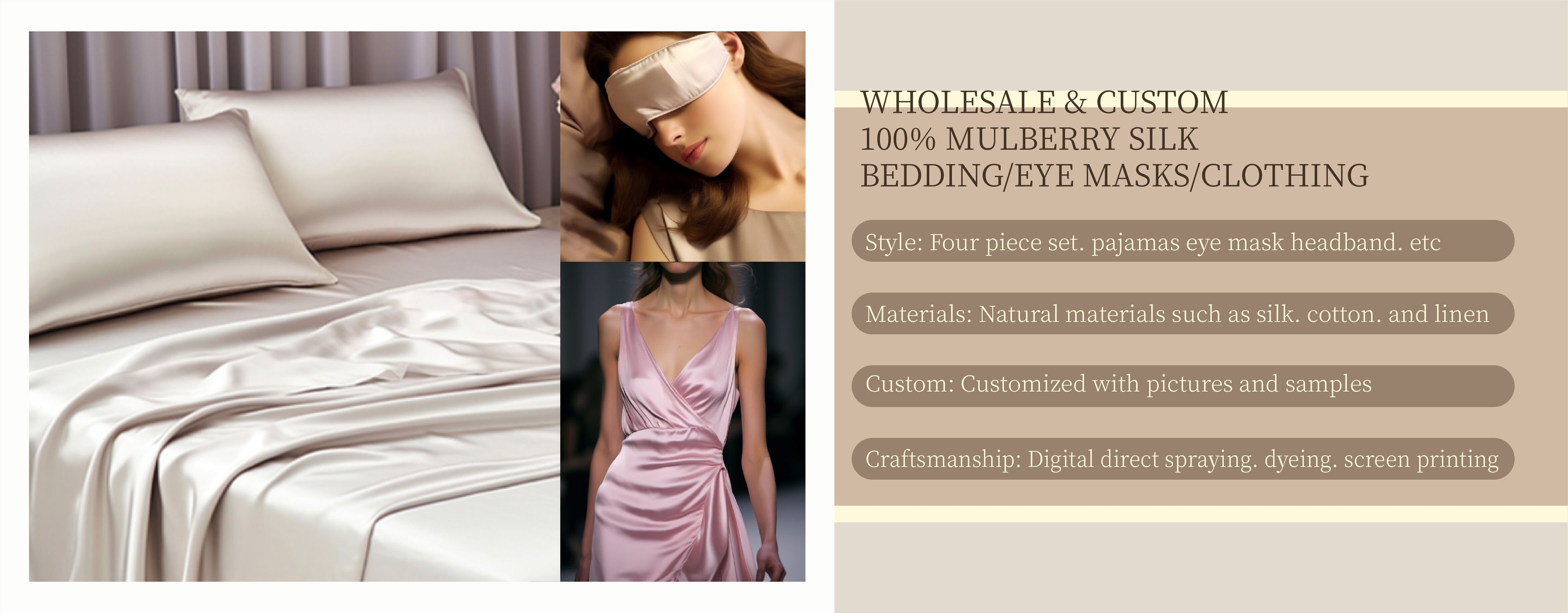 Custom fabrics, materials including all kinds of silk, cotton, linen, wool, silk...